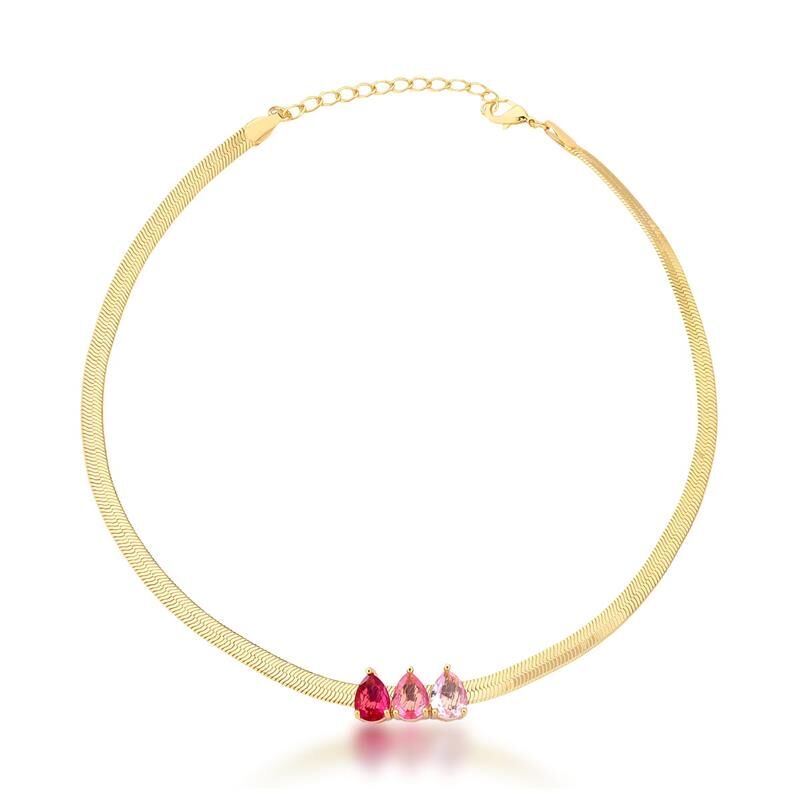 A choker laminada em degradê é composta por delicados cristais nas cores vermelho, magenta e rosa claro, em composições belíssimas que incluem a forma do coração, além de braceletes, correntes, anéis e brincos clássicos. Choker laminada com pingente de cristais em gota no degradê rosa banhada a ouro.