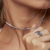 reluzente do ródio em malhas, variações de rivieras, brincos e piercings que agradam todos os perfis de público. Colar riviera com três flores cravejado de cristais redondos banhado a ródio.
